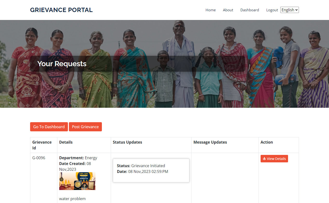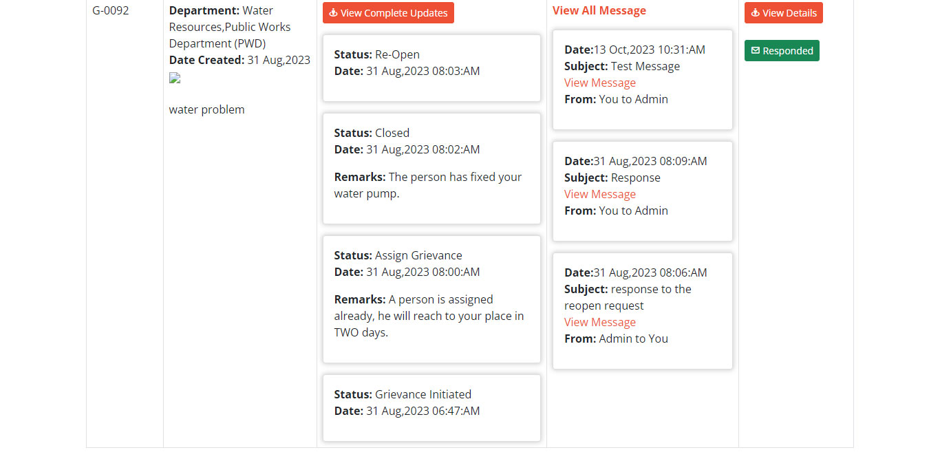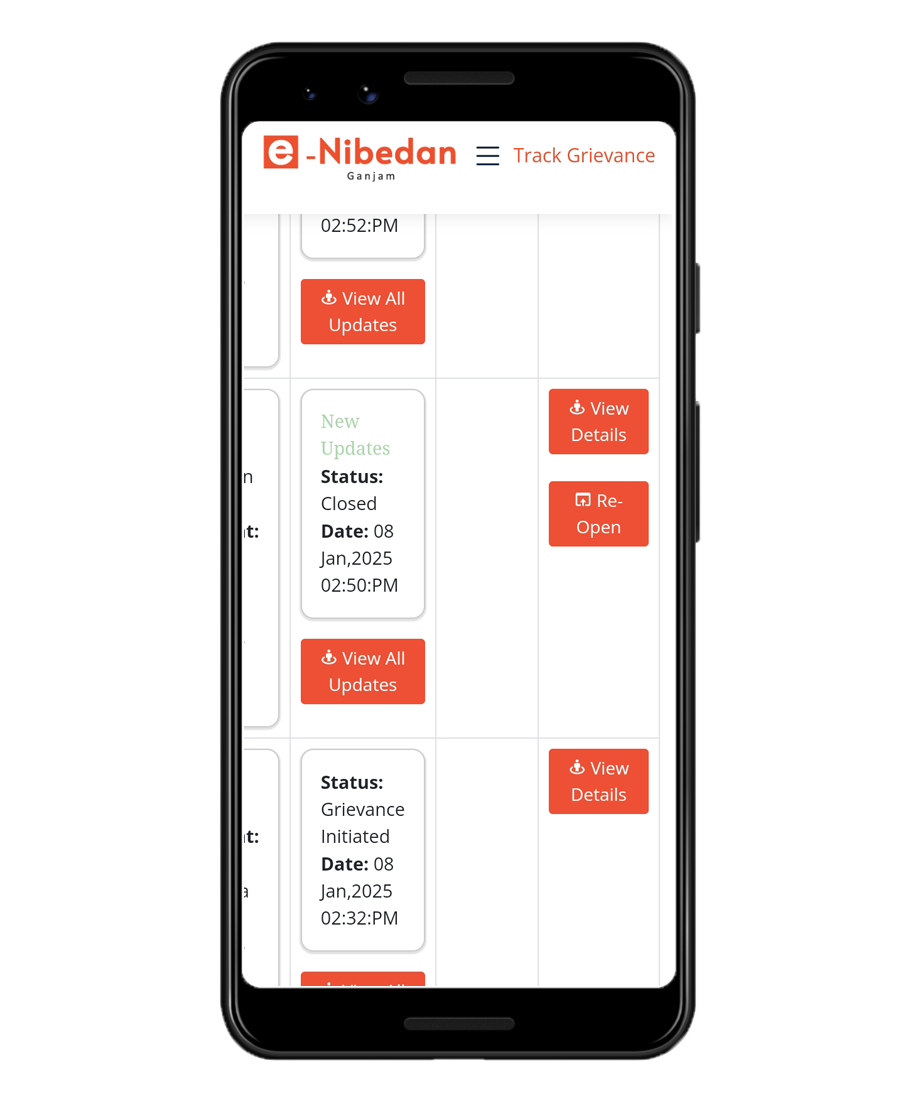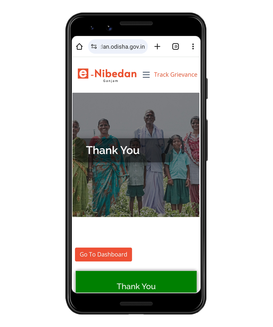 ତୁମର ପଞ୍ଜୀକୃତ ମୋବାଇଲ୍ ନମ୍ବର ଏବଂ ଇମେଲ୍ id ରେ ତୁମେ ଏକ ସ୍ୱୟଂଚାଳିତ ବାର୍ତ୍ତା ପାଇବ | ଆପଣ ପୋର୍ଟାଲକୁ ଲଗ୍ଇନ୍ କରିପାରିବେ ଏବଂ “ଟ୍ରାକ ଅଭିଯୋଗ ସ୍ଥିତି” ବିଭାଗ ଅଧୀନରେ ସବିଶେଷ ପ୍ରତିକ୍ରିୟା ଦେଖିପାରିବେ |